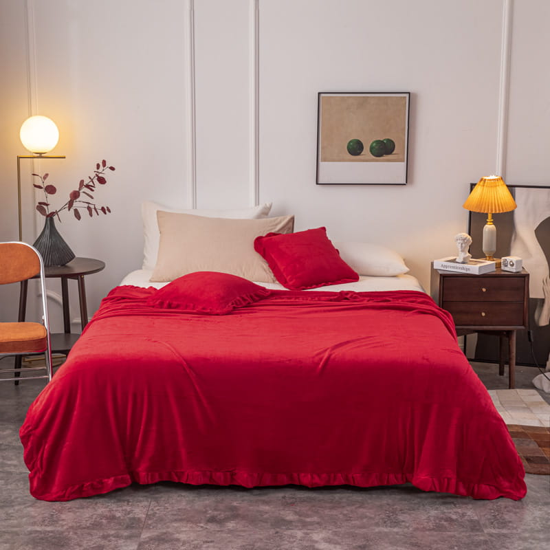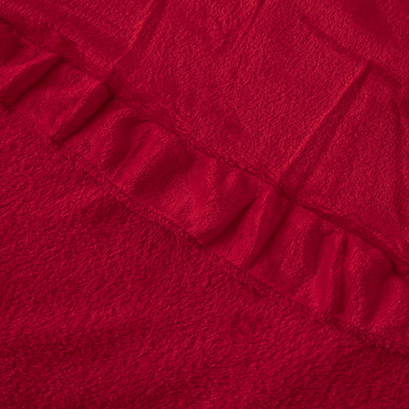 Czerwony koc świąteczny z falbankami sprawdzi się też jako prezent na Gwiazdkę czy Mikołajki. Piękna czerwień doskonale wpisze się pod zieloną choinką.