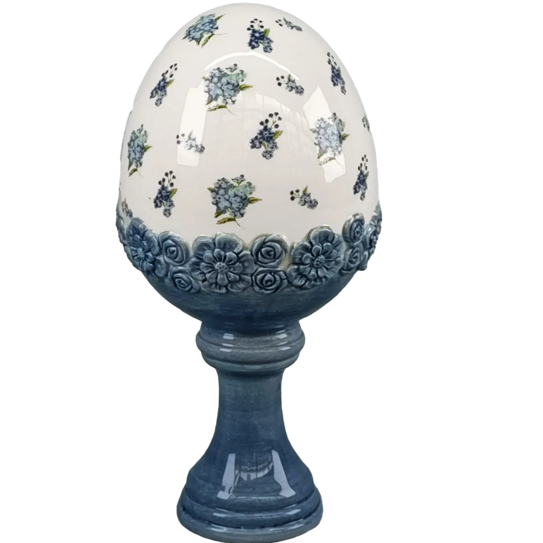 Ozdoba z niebieskimi kwiatami to dekoracyjne jajko wykonane z ceramiki w kolorze niebiesko-białym. Wymiary 11,7 x 11,7 x 24 cm sprawiają, że doskonale prezentuje się na stole lub komodzie dodając wnętrzu świeżości i elegancji.