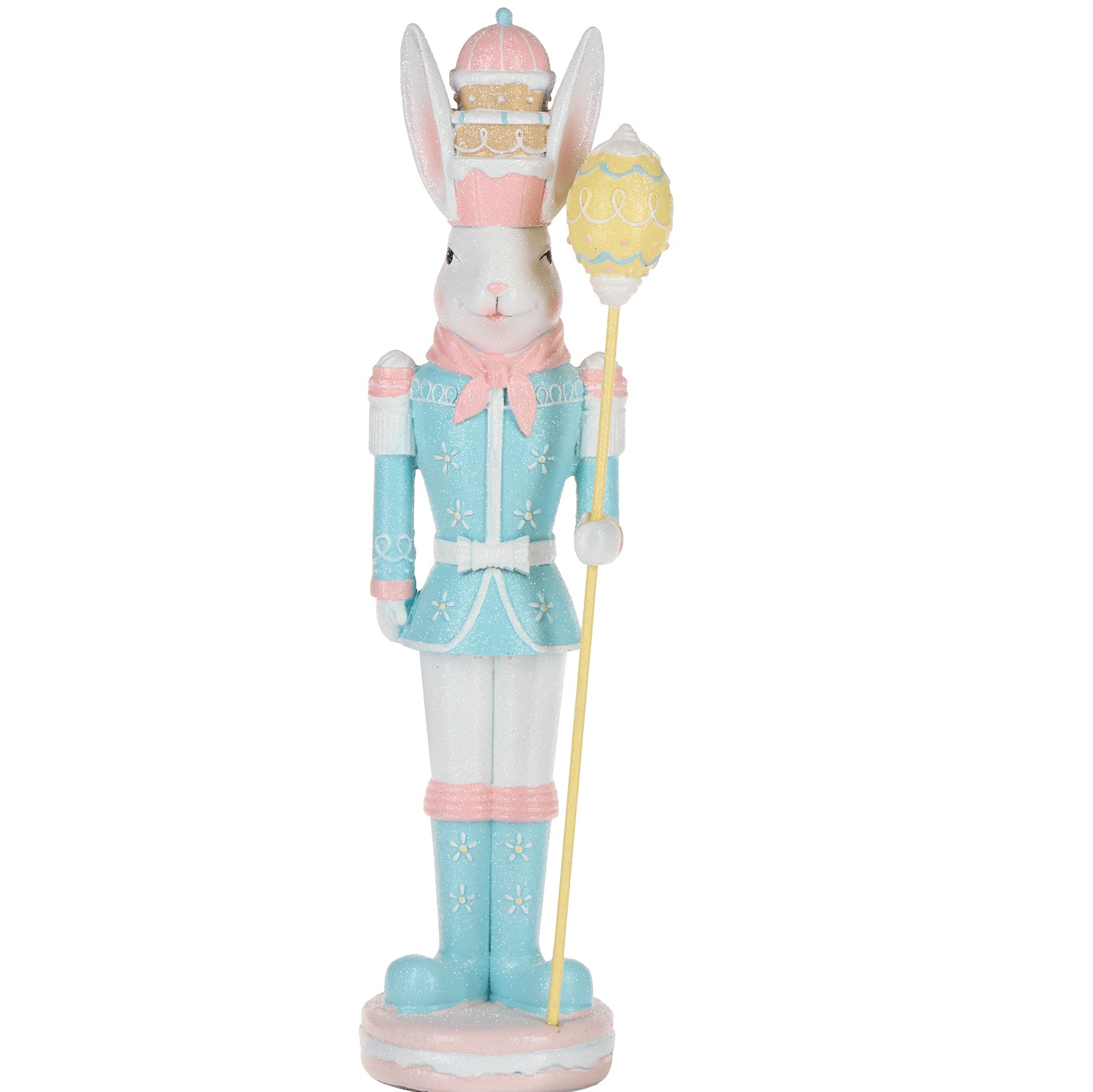 Ozdoba wielkanocna przedstawiająca królika, wykonana z żywicy poliestrowej, to stylowy i subtelny element świątecznej dekoracji. Wymiary 12,5 x 10 x 41 cm sprawiają, że doskonale prezentuje się na stole, komodzie lub półce. Delikatna pastelowa kolorystyka nadaje jej elegancki i przytulny charakter, doskonale komponując się zarówno z klasycznymi, jak i nowoczesnymi aranżacjami wnętrz.
