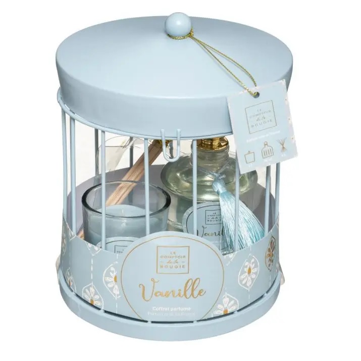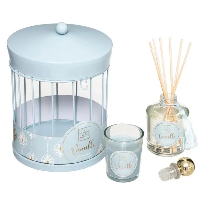 Pudełko zapachowe 1 dyfuzor zapachowy 6 patyczków 1 świeca zapachowa (-) metalowy koszyk wymiary: śr. 13,2 x godz. 19 cm -wymiary: świeca: śr. 5 x godz. 6 cm – dyfuzor: śr. 6 x godz. 8 cm – sztyfty: wys. 16cm. – materiał: szkło, wosk, olej i żelazo – dyfuzor 90 ml –