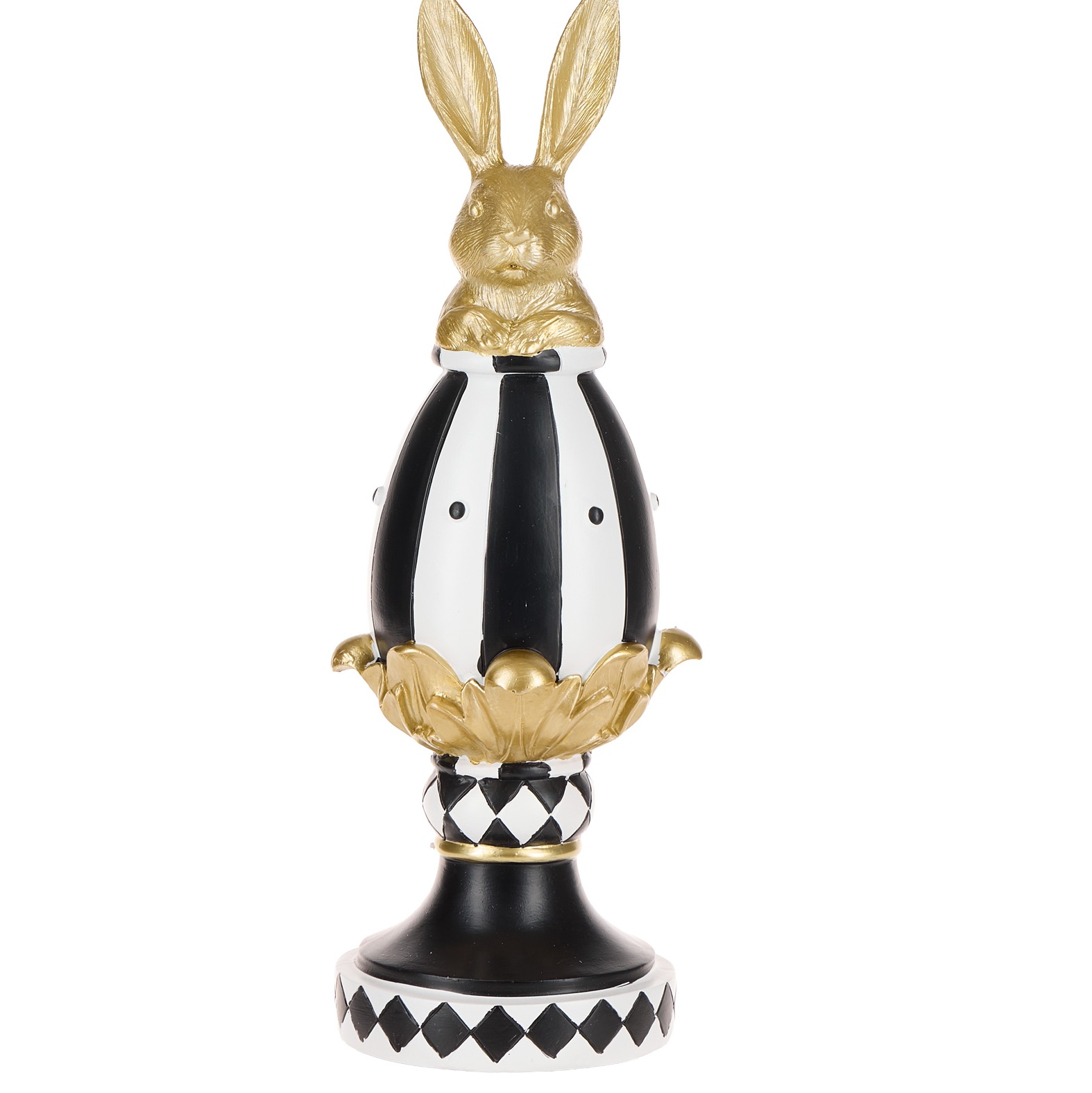 Ozdoba wielkanocna  przedstawiająca królika na podstawie, wykonana z żywicy, to elegancki i stylowy element świątecznej dekoracji. Połączenie kolorów białego, czarnego i złotego nadaje jej nowoczesny i wyrafinowany charakter. Doskonale prezentuje się na stole, komodzie lub półce, wprowadzając wyjątkowy, wielkanocny akcent do wnętrza. Idealna do klasycznych i nowoczesnych aranżacji.