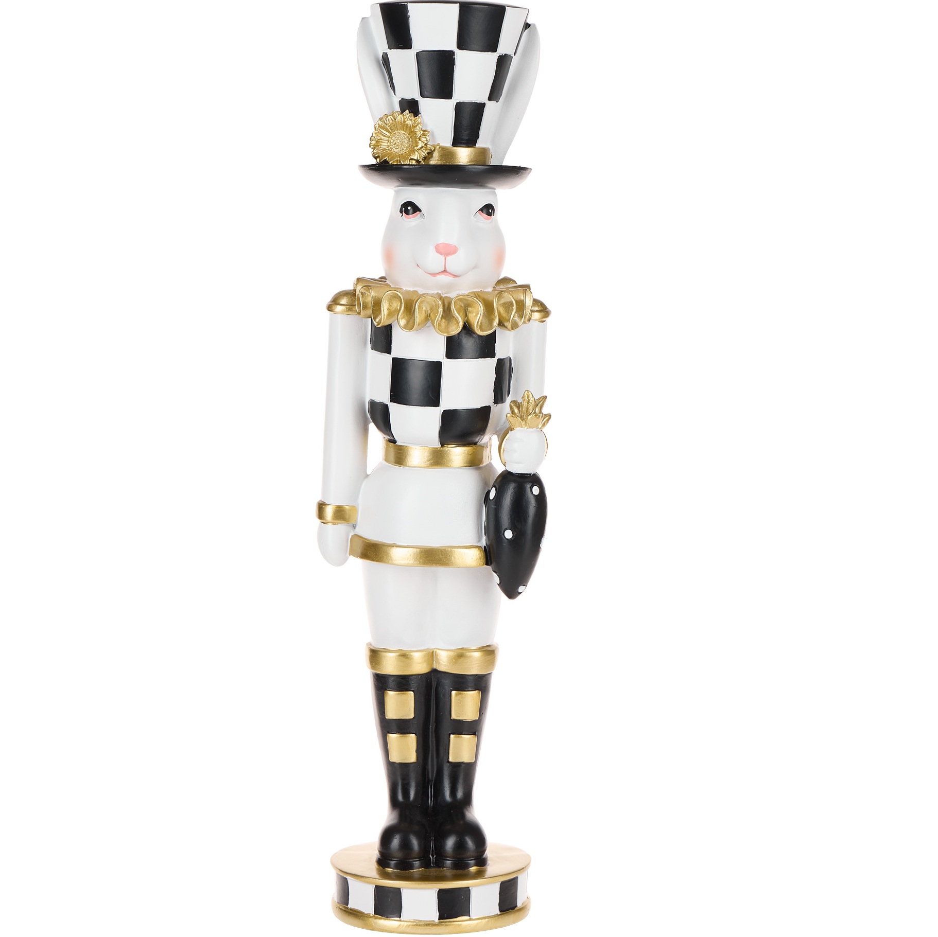 Ozdoba wielkanocna w kształcie królika wykonana z żywicy to elegancki i stylowy dodatek do świątecznej dekoracji. Połączenie kolorów białego, czarnego i złotego nadaje jej nowoczesny i wyrafinowany charakter. Jej wymiary 12 x 10 x 46 cm sprawiają, że doskonale prezentuje się na stole, komodzie lub półce, wprowadzając wyjątkowy, świąteczny klimat do wnętrza.