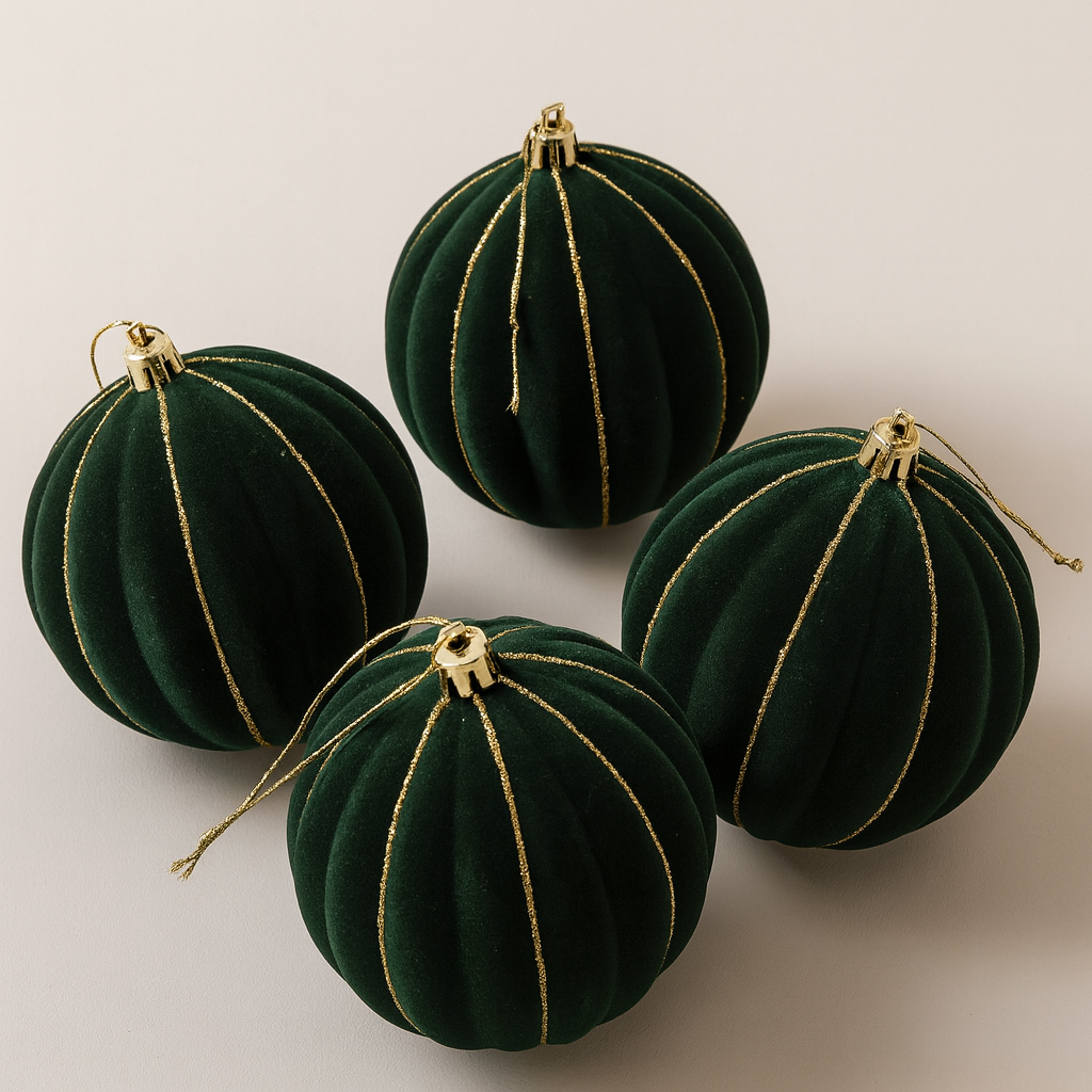 Poczuj magię Świąt w swoim domu dzięki zestawowi 4 eleganckich bombek choinkowych w odcieniu głębokiej zieleni ze złotym wykończeniem. Ich welurowa powierzchnia subtelnie odbija światło, tworząc niepowtarzalny świąteczny blask i wprowadzając do wnętrza atmosferę spokoju i ciepła. To idealne dekoracje bożonarodzeniowe dla tych, którzy cenią styl i klasę w świątecznych aranżacjach.